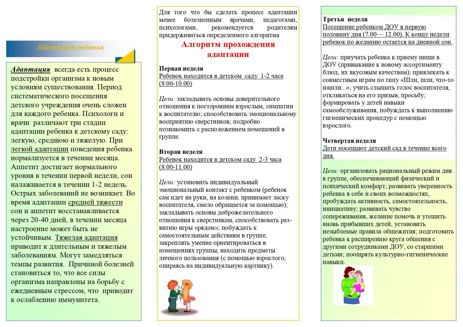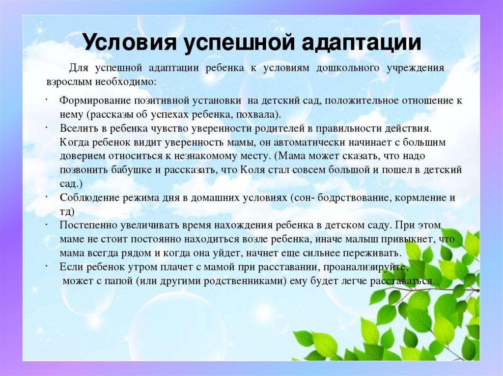 Адаптационный период для каждого ребёнка проходит по-разному и определяется особенностями его нервной системы, уровнем развития общения, общим эмоциональным фоном (настроением), семейными обстоятельствами. Необходимо помнить, что перемены в жизни ребёнка – это также тест на родительскую компетентность, показатель того насколько родители готовы поддерживать ребёнка, помогать ему преодолевать трудности. Помните о том, что на новом жизненном этапе малыш учиться приобретать опыт построения отношений с миром и Вами, делает важные шаги на пути своего развития, развития своей личности. Родительская поддержка, принятие тревог и забот ребёнка, уверенность в том, что он справиться со всеми трудностями придадут маленькому человеку веру в свои силы и обеспечат необходимый эмоциональный настрой.