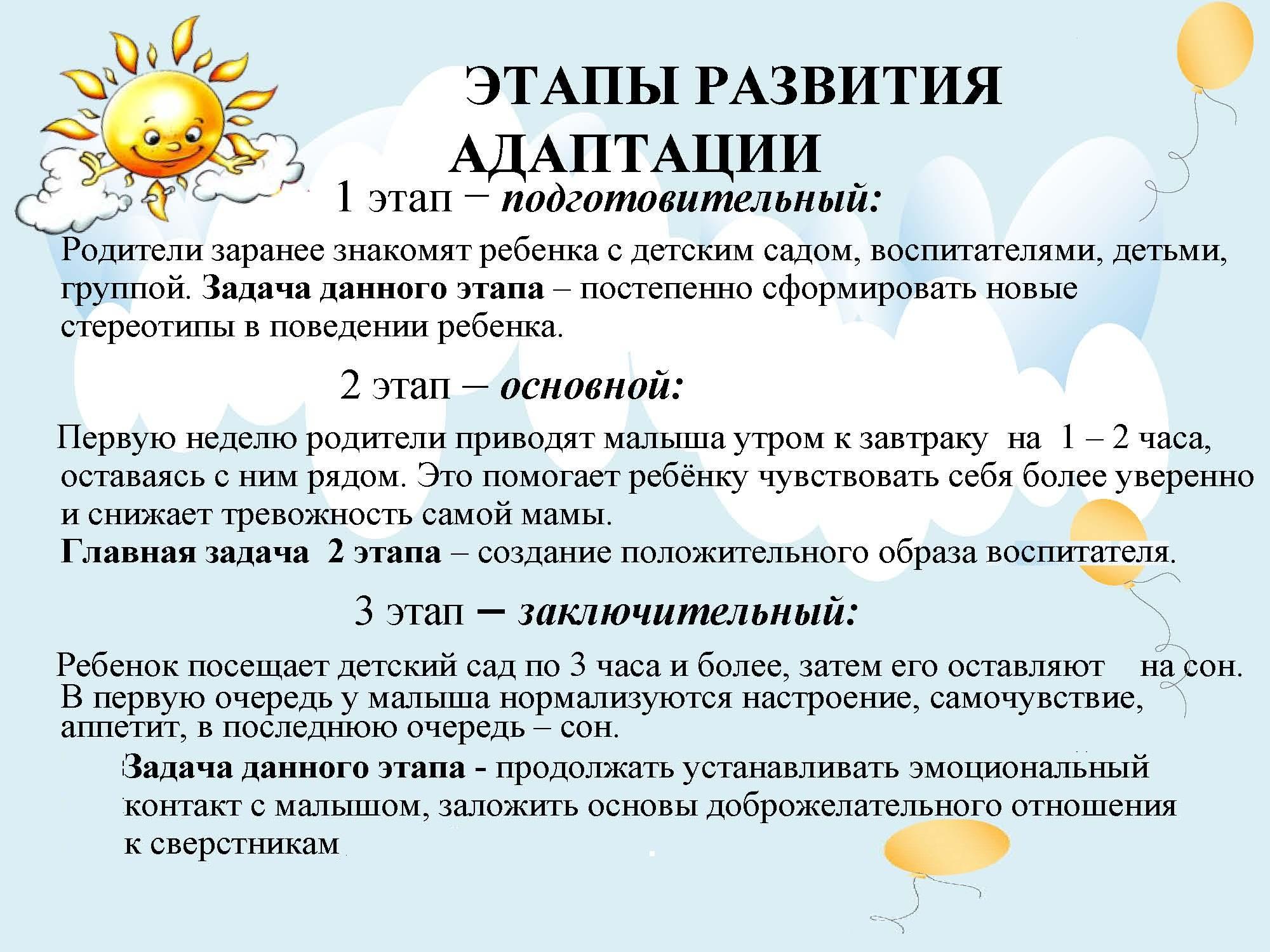 - В результате ребенку приходиться приспосабливаться к новым условиям, а это в свою очередь требует от него разрушения некоторых уже сложившихся ранее связей и быстрого образования новых. На данном этапе ребенок переживает адаптационный период.