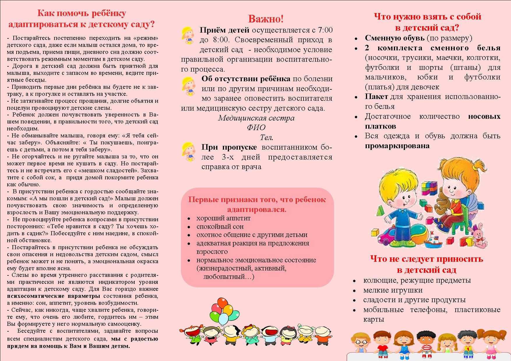 Так адаптация начнется еще за несколько месяцев до момента поступления в новый садик. Это место уже не будет казаться каким-то страшным, далеким, незнакомым. Если увидеть садик и познакомиться заранее с воспитателем, все покажется проще. Малыш будет уверен в себе, когда настанет день идти туда уже не на экскурсию.
